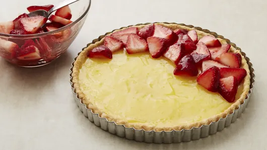 Step5Heat jam in microwave 10 seconds; add to sliced strawberries, stirring gently to coat. Spoon strawberries evenly over top of tart, and serve. Cover and refrigerate any remaining tart.