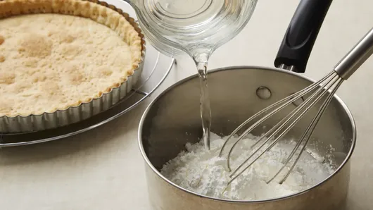 Step4Gradually stir egg mixture back into hot mixture. Stir in lemon peel and lemon juice. Cook over medium heat 5 minutes, stirring constantly. Remove from heat. Add butter; stir until melted. Let stand 10 minutes. Carefully pour hot lemon filling into crust. Cool 2 hours at room temperature. Refrigerate 1 hour before serving.