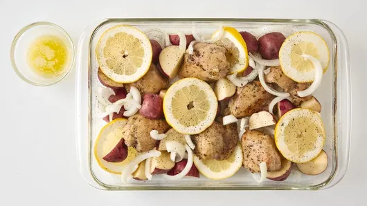Step4Arrange chicken thighs, potatoes, onions and lemon slices in baking dish. Sprinkle with remaining 1/2 teaspoon salt and 1/4 teaspoon pepper. Melt remaining 1 tablespoon butter, and drizzle over mixture.