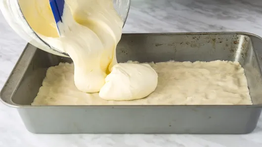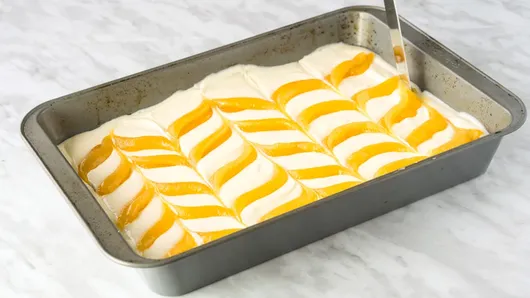 Step3Place 1 cup lemon curd in small resealable food-storage plastic bag; seal bag. Cut off small bottom corner of bag. Squeeze lemon curd on cream cheese mixture in 5 thick lines going the length of the pan. Use knife to pull all of lemon curd lines from top to bottom (side to side) through cream cheese mixture at 1-inch intervals.