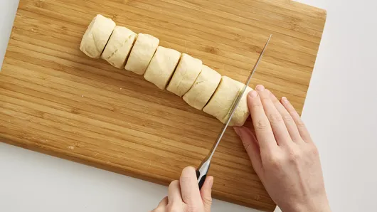 Step1Heat oven to 375°F. Remove dough from can; do not unroll. Using serrated knife, cut dough into 8 slices. Place 2 inches apart on cookie sheet. Press each slice into 3-inch round, leaving ridge around outer edge.