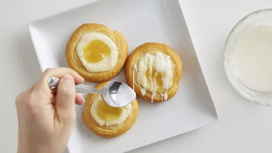 Step4In small bowl, mix 1/2 cup powdered sugar with enough milk for desired drizzling consistency. Drizzle glaze over Danish. Serve warm.