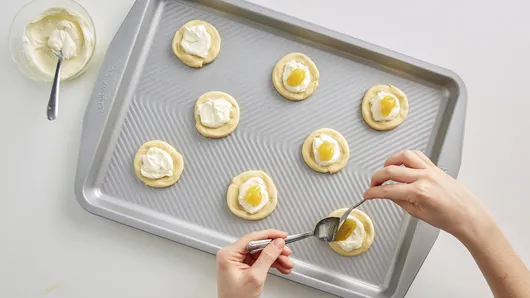 Step2In small bowl, mix cream cheese spread and 3 tablespoons powdered sugar. Spoon about 2 teaspoons cream cheese mixture on center of each dough round; spread slightly. Top each with 1 teaspoon lemon curd.