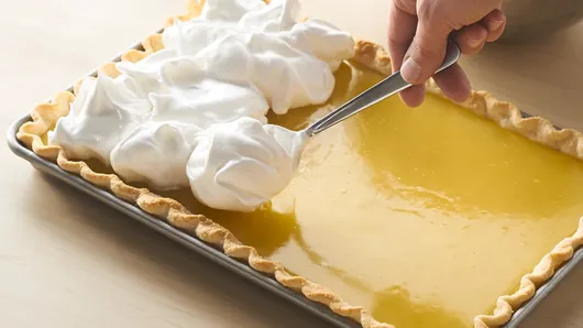 This lemon meringue slab pie is perfect for serving a crowd. Lemon desserts are popular and this pie is no exception—it's great for potlucks and spring gatherings.