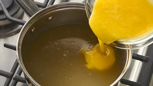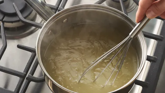 Step4In small bowl, beat egg yolks with whisk. Gradually beat about 1/2 cup hot mixture into egg yolks. Gradually stir yolk mixture into hot mixture in saucepan. Cook over medium heat, stirring constantly, until mixture starts to gently boil. Cook 2 minutes longer, stirring constantly. Remove from heat and stir in butter; cover and keep warm.