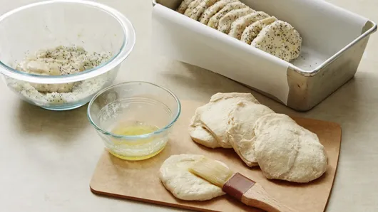 Step3Separate dough into 8 biscuits. Separate each biscuit into 2 layers. Brush both sides of each biscuit layer with melted butter, then dip into poppy seed mixture. Starting at one short end of pan, place biscuit layers on their edges, just touching each other, until pan is loosely filled. Sprinkle any remaining poppy seed mixture between biscuits.