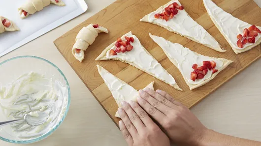Step3Separate dough into 8 triangles. Spread about 1 tablespoon of the cream cheese mixture evenly onto each triangle. Spoon 1 tablespoon strawberries onto cream cheese at wide end of each triangle. Roll up, starting at widest end to pointed end. Place each roll pointed end down on cookie sheet. Brush with melted butter.