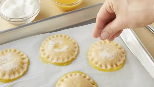 Step5With handle of knife, press edges to seal; cut “x” in center of each cookie pie. Brush each cookie with egg wash; sprinkle with sugar. Place on cookie sheet.