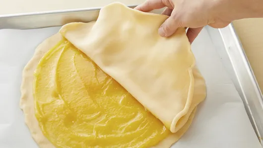 Step3Unroll pie crusts. Spread lemon curd on 1 of the crusts, leaving 1/2-inch border around edge. Place second crust on top.