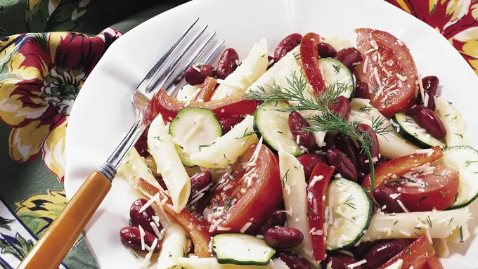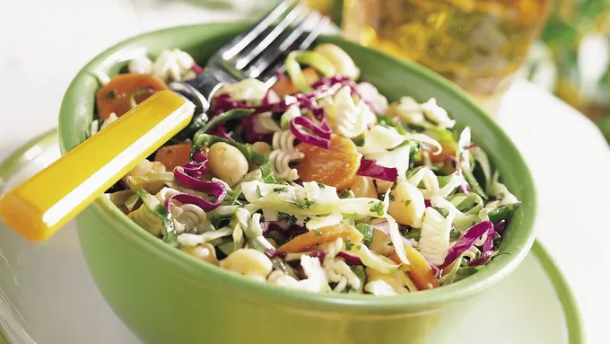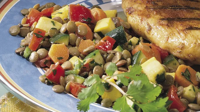 Step4In large bowl, combine pasta, lentils and all remaining salad ingredients. Pour dressing over salad; toss gently to coat. Refrigerate at least 1 hour to blend flavors. If desired, serve on bed of leaf lettuce.
