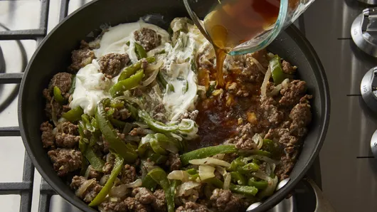 Step2Meanwhile, in 12-inch nonstick skillet, cook beef, onions, bell peppers and steak seasoning over medium-high heat 9 to 11 minutes, stirring occasionally, until beef is thoroughly cooked and vegetables are tender; do not drain. Remove from heat. Stir in cream cheese until melted. Stir in hot macaroni and broth.