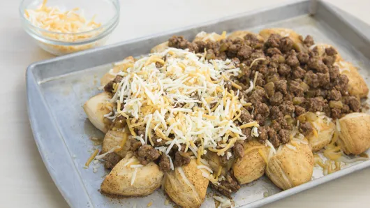 Step4Top biscuit pieces with 1 cup of cheese, beef mixture and remaining 1 cup of cheese. Bake 5 to 7 minutes longer or until cheese is melted and biscuits are golden brown. Top warm biscuits with tomatoes, green onions and other fresh toppings as desired. Serve immediately.