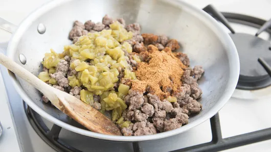 Step3Meanwhile, in 10-inch skillet, cook beef 6 to 8 minutes over medium-high heat, stirring frequently, until fully cooked and no longer pink; drain. Stir in remaining taco seasoning and green chiles. Reduce heat to medium; cook 2 to 3 minutes longer or until heated through.