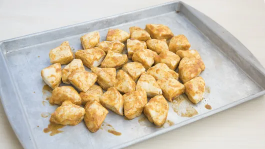 Step1Heat oven to 350°F (or 325°F for dark nonstick pan). Spray 15x10x1-inch pan with cooking spray. Separate dough into 8 biscuits; cut into quarters. In large bowl, toss biscuit pieces with melted butter and 1 tablespoon of taco seasoning mix until well coated.