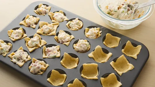 Step1Heat oven to 375°F. Spray 24 mini muffin cups with cooking spray. Unroll dough on work surface. Press into 12x8-inch rectangle. (If using crescent roll dough, firmly press perforations to seal.) With pizza cutter or sharp knife, cut into 6 rows by 4 rows to make 24 squares. Press 1 square in bottom and up side of each muffin cup.