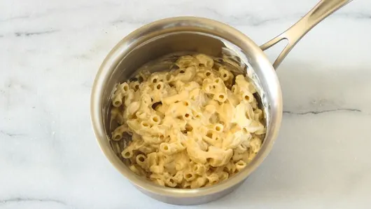Step5Add drained, cooked macaroni to cheese sauce; stir with wooden spoon until all macaroni is coated.