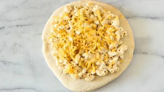 Step6Spread macaroni in cheese sauce over baked crust to within about 1 inch from edge. Sprinkle remaining 1/4 cup cheese over top of macaroni.