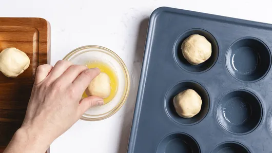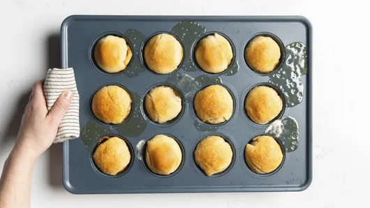 Make sure your muffin pan is well greased before you start this step, so your puffs don’t stick. Then, dip the bottom of each roll in melted butter and place each puff in the muffin cup. Bake in a 375°F oven until puffy and golden.