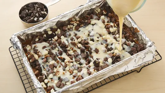 Step2Top dough evenly with 1 cup of the Oreos™, the chocolate chunks, milk chocolate chips and pecans. Pour sweetened condensed milk evenly over bar base. Sprinkle evenly with remaining 1 cup Oreos™ and vanilla baking chips.