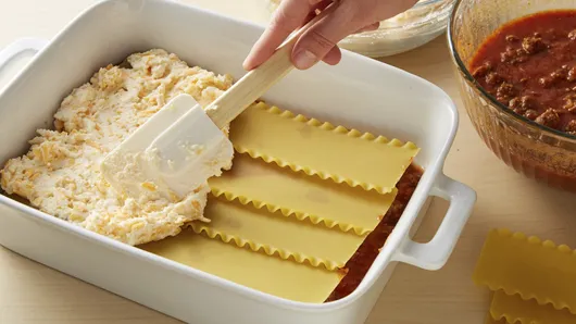 Step3Spread 1 cup beef mixture in bottom of sprayed baking dish. Arrange 4 uncooked noodles over sauce. Spoon and spread half of ricotta cheese mixture over noodles; top with 1 1/2 cups beef mixture. Repeat layers once. Top with remaining 4 noodles, beef mixture and the 1 cup Cheddar cheese. Cover with foil; refrigerate at least 8 hours or overnight.