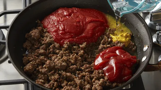 Step1Spray 13x9-inch (3-quart) baking dish and large nonstick skillet with nonstick cooking spray. In sprayed skillet, cook ground beef and onion over medium-high heat 5 to 7 minutes or until beef is thoroughly cooked, stirring frequently. Add tomato sauce, water, ketchup and mustard; mix well. Simmer 5 minutes, stirring occasionally.