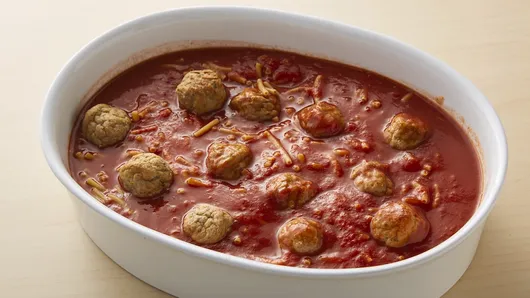 Step1Grease 12x8-inch (2-quart) baking dish. In greased baking dish, combine uncooked spaghetti, water and spaghetti sauce; mix well. Add meatballs; turn to coat with sauce. (Cover spaghetti completely with sauce.) Cover tightly with foil; refrigerate at least 8 hours or overnight.