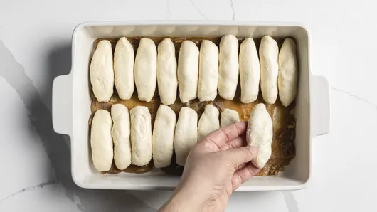 Arrange rolls, seam side down, in 2 rows of 10 rolls each over brown sugar mixture in pan.