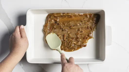 Heat oven to 350°F. In ungreased 13x9-inch baking dish or pan, combine brown sugar, nuts, syrup, and 1/4 cup melted butter; spread evenly in bottom of pan.