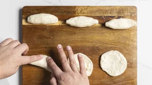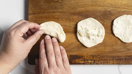 Overlap sides of dough over filling, forming finger-shaped rolls.