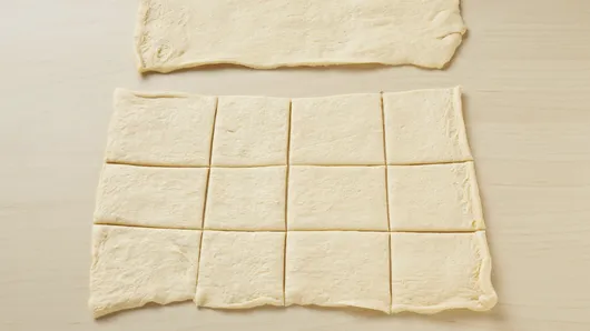 With pizza cutter or sharp knife, cut rectangle into 4 rows by 3 rows to make 12 squares (2 cuts lengthwise and 3 cuts crosswise). Repeat with second can of dough.
