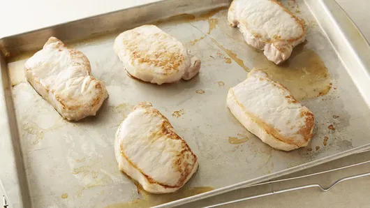 Step1Heat oven to 400°F. Spray large nonstick skillet with nonstick cooking spray. Heat over medium-high heat until hot. Add pork chops; cook until browned on both sides. Place pork chops in ungreased 15x10x1-inch baking pan. Sprinkle with salt and pepper. Cover with foil. Bake at 400°F. for 10 minutes.