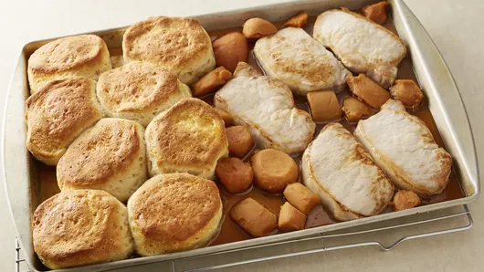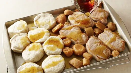 Step2Remove pork chops from oven. Move pork chops to one side of pan; drain and discard drippings. Arrange sweet potatoes around pork chops. Separate dough into 8 biscuits; arrange in pan next to pork chops and potatoes. Drizzle syrup over pork chops, potatoes and biscuits.