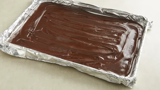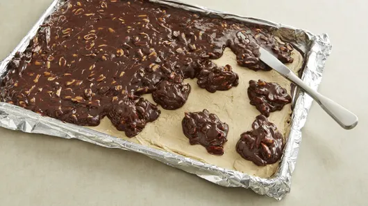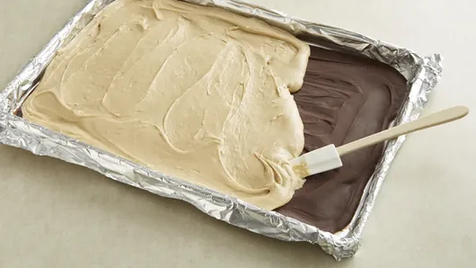 Step1Line 15x10x1-inch baking pan with foil. Butter or spray foil with cooking spray. In large saucepan, melt chocolate chips and 1 cup of the butter over low heat, stirring frequently. Remove saucepan from heat. Stir in peanut butter until well blended. Spread half of mixture in pan. Freeze 10 minutes or until set. Place pan in refrigerator.