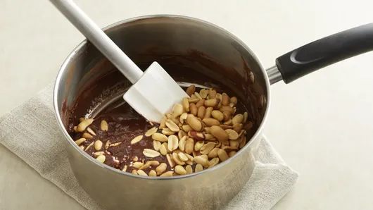 Step2Meanwhile, stir peanuts into remaining chocolate mixture. Set aside.