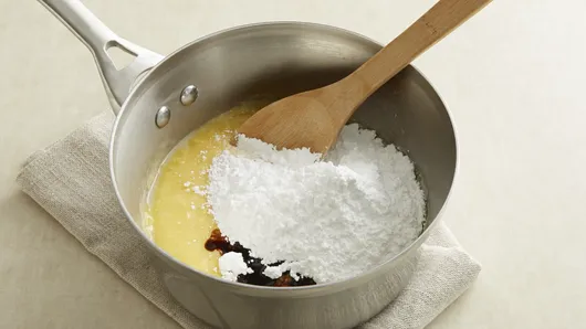 Step3Melt remaining 1 cup butter in large saucepan over low heat. Gradually stir in evaporated milk. Stir in pudding mix. Cook until mixture is slightly thickened, stirring constantly. DO NOT BOIL. Remove saucepan from heat. Add powdered sugar and maple flavor; mix well. Cool about 10 minutes or until slightly cooled.