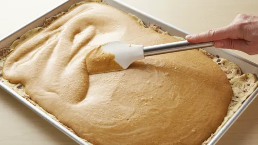 Step4Bake 33 to 38 minutes or until edges are deep golden brown and center is set. Cool completely in pan on cooling rack, about 1 hour. Refrigerate 1 hour before cutting and serving.