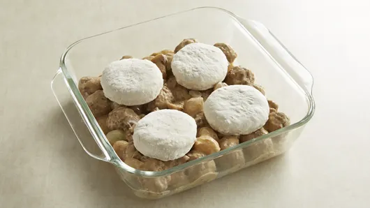 Step3Pour mixture into baking dish. Arrange frozen biscuits over top.