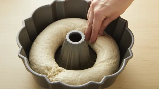 Remove dough from both cans; do not unroll. Place in pan in a circle; pinch both ends of dough firmly together to seal into 1 ring. Bake 33 to 38 minutes or until golden brown. Cool slightly, about 10 minutes. Remove bread from pan to cooling rack. Cool completely, about 1 hour.
