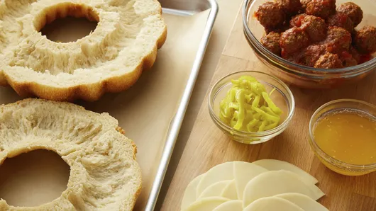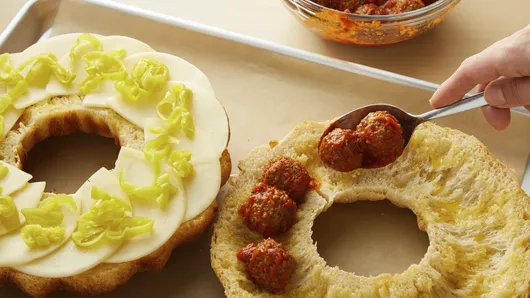 Use decorative side of bread ring for top of Bundtwich. Place cheese slice halves and pepperoncini in decorative side of bread ring. Spread meatball mixture in other side of bread ring. Bake 8 to 12 minutes or until cheese is melted and rings are hot.