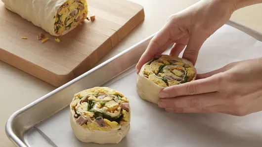 Starting at short end, tightly roll up dough, patting sides to retain 10-inch length. Pinch edges to seal; place seam side down on cutting board. With serrated knife, cut into 6 equal slices. Place cut side up 2 inches apart on pan. For even baking, reshape buns; press tops down slightly. Bake 13 to 15 minutes or until golden brown.