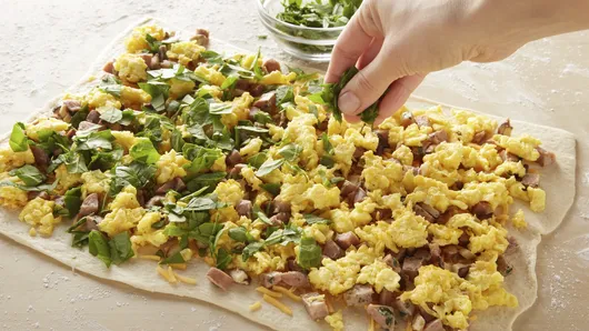 var configuration = {"title":"Mediterranean Breakfast Buns","introduction":"From impressing brunch guests with their pretty spirals, to packing up for a filling breakfast on the go, there isn’t anything these chicken sausage and cheddar cheese breakfast buns can’t do!","servingSize":"1 Serving","image":{"small":{"media":"(min-width: 0px)","src":"https://mojo.generalmills.com/api/public/content/3DSiuHUDsEmcMJa7lT_c2w_webp_base.webp?v=5170c67f\u0026t=e724eca7b3c24a8aaa6e089ed9e611fd"},"medium":{"media":"(min-width: 500px)","src":"https://mojo.generalmills.com/api/public/content/3DSiuHUDsEmcMJa7lT_c2w_webp_base.webp?v=5170c67f\u0026t=191ddcab8d1c415fa10fa00a14351227"},"large":{"media":"(min-width: 767px)","src":"https://mojo.generalmills.com/api/public/content/3DSiuHUDsEmcMJa7lT_c2w_webp_base.webp?v=5170c67f\u0026t=191ddcab8d1c415fa10fa00a14351227"},"alt":"Mediterranean Breakfast Buns"},"contributor":{"label":"By","name":"Pillsbury Kitchens","profileUrl":"/about-us","displayDate":{"label":"Updated","date":"Jan 9, 2018"}},"ingredientGroups":[{"ingredients":[{"quantity":"3","description":"tablespoons butter"},{"quantity":"1/2","description":"cup diced fresh shiitake mushrooms (1 oz)"},{"quantity":"2","description":"spinach and feta smoked chicken sausages, chopped (from 12-oz package)"},{"quantity":"5","description":"eggs, beaten"},{"quantity":"1/8","description":"teaspoon kosher salt"},{"quantity":"1/8","description":"teaspoon black pepper "},{"quantity":"1 1/2","description":"cups shredded sharp Cheddar cheese (6 oz)"},{"quantity":"1","description":"can (11 oz) refrigerated Pillsbury™ Thin Crust Pizza Crust"},{"quantity":"1","description":"cup loosely packed fresh baby spinach, chopped (from 5-oz bag)"},{"quantity":"6","description":"fresh sage leaves"}]}],"steps":[{"description":"Heat oven to 400°F. Line 15x10x1-inch pan with cooking parchment paper."},{"description":"In 10-inch nonstick skillet, melt 1 tablespoon of the butter over medium heat. Add mushrooms and sausage; cook 3 to 4 minutes, stirring frequently, until mushrooms are tender and sausage is thoroughly heated. Remove from skillet to plate."},{"description":"In medium bowl, beat eggs, salt and pepper with whisk until well beaten."},{"description":"In same skillet, melt 1 tablespoon of the butter over medium heat. Add egg mixture; cook 2 to 3 minutes, stirring frequently, until firm but moist. Stir in 3/4 cup of the cheese; remove from heat. Cool 10 minutes."},{"description":"Lightly sprinkle large cutting board with flour. Unroll pizza dough on board; press into 14x10-inch rectangle. Top evenly with remaining 3/4 cup cheese, the sausage mixture and eggs; press down slightly. Sprinkle chopped spinach evenly over eggs.","stepShotImageUrl":"//mojo.generalmills.com/api/public/content/qfGmX4T_uUC8E5wZvPaKOQ_webp_base.webp?v=297eec13\u0026t=51a43a57af4046789e5a7f20567b1195"},{"description":"Starting at short end, tightly roll up dough, patting sides to retain 10-inch length. Pinch edges to seal; place seam side down on cutting board. With serrated knife, cut into 6 equal slices. Place cut side up 2 inches apart on pan. For even baking, reshape buns; press tops down slightly. Bake 13 to 15 minutes or until golden brown.","stepShotImageUrl":"//mojo.generalmills.com/api/public/content/ap-aoyfmEka4pbEOiQSImQ_webp_base.webp?v=2072dfaa\u0026t=51a43a57af4046789e5a7f20567b1195"},{"description":"Meanwhile, in 8-inch nonstick skillet, melt remaining 1 tablespoon butter over medium heat. Add sage leaves; cook 1 to 2 minutes, turning frequently, until crisp. Remove sage to paper towel; crumble. Reserve butter in skillet.","stepShotImageUrl":"//mojo.generalmills.com/api/public/content/mDls19mHckaORl32P5mKuA_webp_base.webp?v=6cdf4220\u0026t=51a43a57af4046789e5a7f20567b1195"},{"description":"Remove buns from oven; brush sides of buns with reserved butter. Bake 1 minute longer. Sprinkle each bun with crumbled sage leaves. Serve warm."}],"tips":[{"title":"","description":"For best results, work with cold dough directly from refrigerator. ","category":"Recipe/Ingredient Facts","tipShots":[]},{"title":"","description":"To make buns easier to cut, refrigerate filled dough about 20 minutes before cutting into individual buns.","category":"Techniques","tipShots":[]},{"title":"","description":"I have been in the kitchen cooking or just helping my mom or my Gram since I was 10 years old. I love to see smiles on my family’s and friends’ faces when they eat something I have made for them. When someone is ill or sad or just plain mad, a homemade meal or a batch of chocolate brownies can make them feel better, even for a few minutes. Food heals the body and soothes the soul.\r\n\r\nI created this breakfast bun for the Pillsbury Bake-Off® Contest because I like a challenge. We need new ideas for breakfast, and this on-the-go breakfast has been a hit with my friends. It is perfect for a family breakfast, a lunch box treat or an on-the-run alternative to fast food. I am always trying to sneak goodness into foods—especially greens and mushrooms. Hopefully you will enjoy my Mediterranean Breakfast Buns, too!","category":"Editorial","tipShots":[]},{"title":"","description":"Kitchen Tested - 12/2017.","category":"Kitchen Tested","tipShots":[]}],"kitchenTips":[{"title":"","description":"For best results, work with cold dough directly from refrigerator. ","category":"Recipe/Ingredient Facts","tipShots":[]},{"title":"","description":"To make buns easier to cut, refrigerate filled dough about 20 minutes before cutting into individual buns.","category":"Techniques","tipShots":[]}],"additionalContent":[],"faq":[],"tipCategories":[{"categoryName":"Editorial","heading":"More About This Recipe","cssClass":"recipePartStory","expandOnInit":false,"expandText":"More +","collapseText":"Less -","expandEventName":"","collapseEventName":"","image":"","tips":[{"title":"","description":"I have been in the kitchen cooking or just helping my mom or my Gram since I was 10 yea