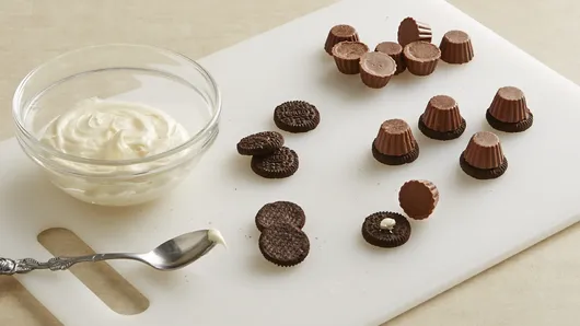 Meanwhile, to make hats, remove creme from sandwich cookies, and attach miniature peanut butter cup to one half of sandwich cookie, using small amount of vanilla frosting. Continue for remaining hats.