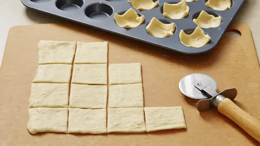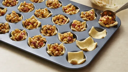 Step1Heat oven to 375°F. Microwave frozen corn as directed on bag. Cut open bag; set aside. Unroll dough on work surface. With pizza cutter, cut into 24 squares. Press 1 square in bottom and up side of each of 24 ungreased nonstick mini muffin cups.