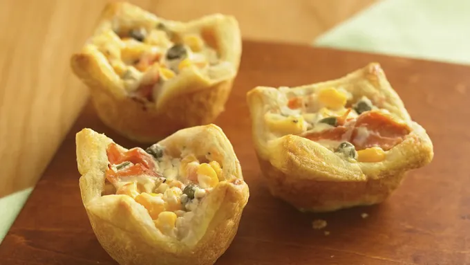 Step1Heat oven to 375°F. Microwave frozen corn as directed on bag. Cut open bag; set aside. Unroll dough on work surface. With pizza cutter, cut into 24 squares. Press 1 square in bottom and up side of each of 24 ungreased nonstick mini muffin cups.