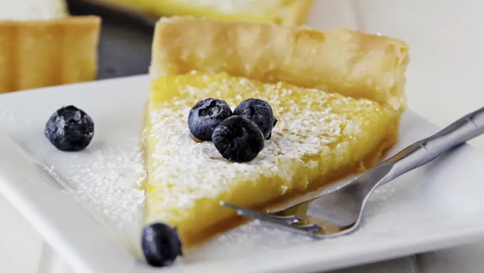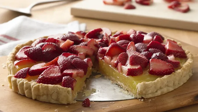 Step3Carefully pour hot lemon filling in crust. Cool 2 hours; top with strawberry slices. Refrigerate until serving time. Remove side of pan. Cover and refrigerate any remaining tart.