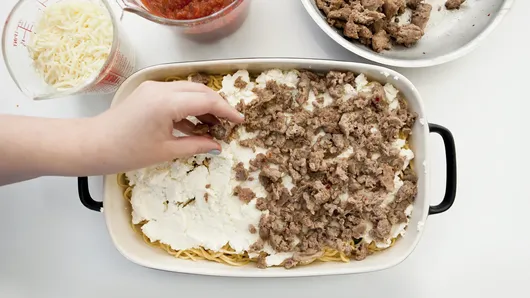 Step5In medium microwavable bowl, place ricotta cheese and cream cheese; microwave uncovered on High 45 to 60 seconds or until softened. Mix well. Drop cheese mixture by spoonfuls over spaghetti mixture; spread evenly. Top with cooked sausage, pasta sauce and mozzarella cheese.
