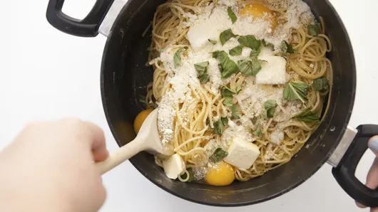 Step4Add butter, eggs, Parmesan cheese and basil to spaghetti; toss until butter is melted and spaghetti is evenly coated. Spread mixture in baking dish.
