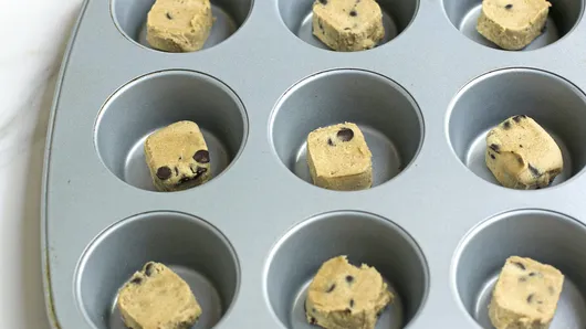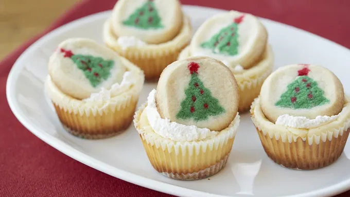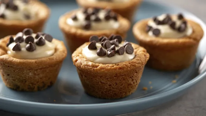 Step1Heat oven to 350°F. Remove 12 dough rounds from cookie dough package; save remaining dough for a later use. Place 1 dough round in each of 12 mini cheesecake cups with removable bottoms.
