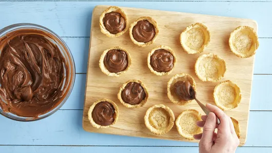 Step4In medium bowl, mix pudding mix and milk; beat 2 minutes with whisk. Spoon mixture evenly into cooled, baked shells (about 2 heaping tablespoonfuls per shell). Refrigerate at least 1 hour until set.