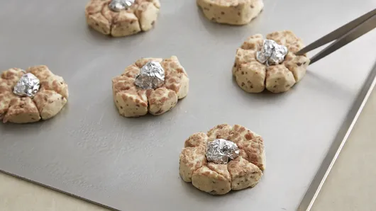 Step3Roll up foil into 8 (1-inch) balls. Place 1 ball in center of each wreath. With kitchen scissors, cut 7 slits almost all the way through dough of each wreath. Bake 9 to 11 minutes or until browned.